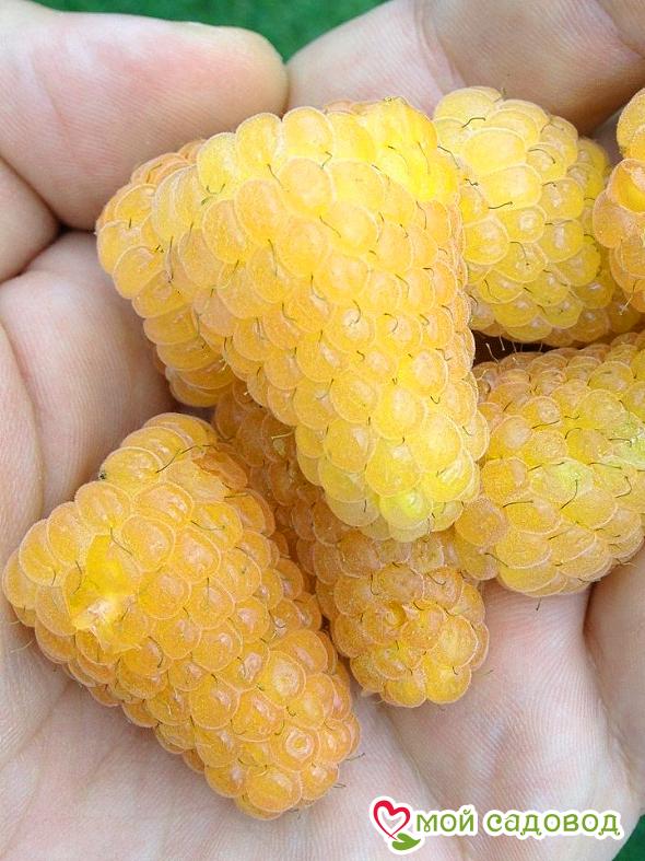 Классический сорт желтоплодной малины раннего срока созревания. Куст мощный, высотой 2 — 2,3 м. Образуется 8 — 10 побегов замещения, но куст сохраняет компактность и не разваливается. Молодые побеги без шипов, на старых — в небольшом количестве. Склонен к сильному ветвлению плодовых веток: до 4 — 5 порядка. Интенсивное развитие корневой поросли. Основное плодоношение на прошлогодних побегах, но в благоприятных условиях возможна вторая волна плодоношения на верхушках молодого прироста. Янтарно-желтые годы ширококонические с тупой вершиной, длиной до 4 см и массой 8 — 10 г. Урожайность с одного куста превышает 4 кг. Из-за плохой транспортабельности используются только для личного употребления. В Средней полосе проявляет недостаточную зимостойкость и требует дополнительной защиты. Побеги гибкие и легко пригибаются для зимнего укрытия. Основные плюсы: десертный вкус ягод крупноплодность редкие, небольшие шипы